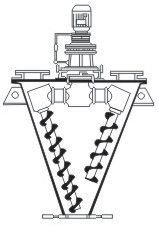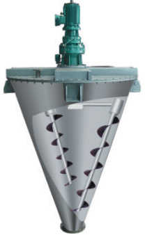 由螺旋的公 、自轉使物料在錐體內產生復合運動,主要產生四種運動形式: 1. 螺旋沿壁公轉,使物料沿錐壁作圓周運動; 2. 螺旋自轉使物料自錐底沿螺旋上升; 3. 螺旋的公 、自轉復合運動使一部分物料被吸收到螺旋圓柱面內同時受螺旋自轉的離心力作用使螺旋圓柱面內的一部分物料向錐體徑向排放; 4. 上升的物料受自身重力作用下降 。四種運動在混合機內產生對流、剪切 、擴散、從而達到快速均勻混合的目的。