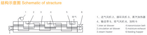 物料由加料器均勻地鋪在網(wǎng)帶上,網(wǎng)帶一般采用12-60目不銹鋼絲網(wǎng),由傳動(dòng)裝置拖動(dòng)在干燥機(jī)內(nèi)移動(dòng)。干燥機(jī)由若干單元組成,每一單元熱風(fēng)獨(dú)立循環(huán),部分尾氣由專門排濕風(fēng)機(jī)排出,廢氣由調(diào)節(jié)閥控制,熱氣由下往上或由上往下穿過(guò)鋪滿物料的網(wǎng)帶完成熱量與質(zhì)量傳遞的進(jìn)程,帶走物料水份。網(wǎng)帶緩慢移動(dòng),運(yùn)行速度可根據(jù)物料溫度自由調(diào)節(jié),干燥后的成品連續(xù)落入收料器中。上下循環(huán)單元根據(jù)用戶需要可靈活配備,單元數(shù)量亦可根據(jù)需要選取。
